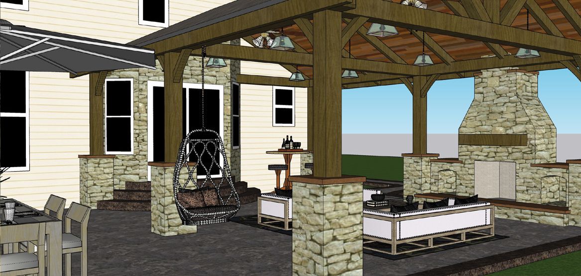The foundation of the design is a unique Ashlar Cut Slate stamped concrete. Key elements include Provia Drystack Stone pillars, a fireplace, and an island, all complemented by a massive white oak timber f rame with yellow pine decking and ceiling. Built with authentic mortise and tenon craftsmanship, the structure is held together by wooden pegs inscribed with the clients’ names, the crew members’ names, and even the Father, Son, and Holy Ghost creating a potential time capsule for future generations. Additional features include a matching timber mantel, locally sourced sandstone accents, Provia stone caps, strategic lighting, and radiant patio heaters to provide warmth. This project perfectly embodies the rustic elegance John and Andrea envisioned.